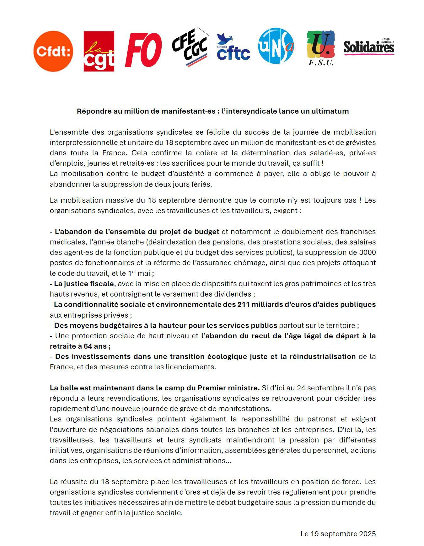 Communiqué intersyndical - Répondre au million de manifestant·es : l’intersyndicale lance un ultimatum