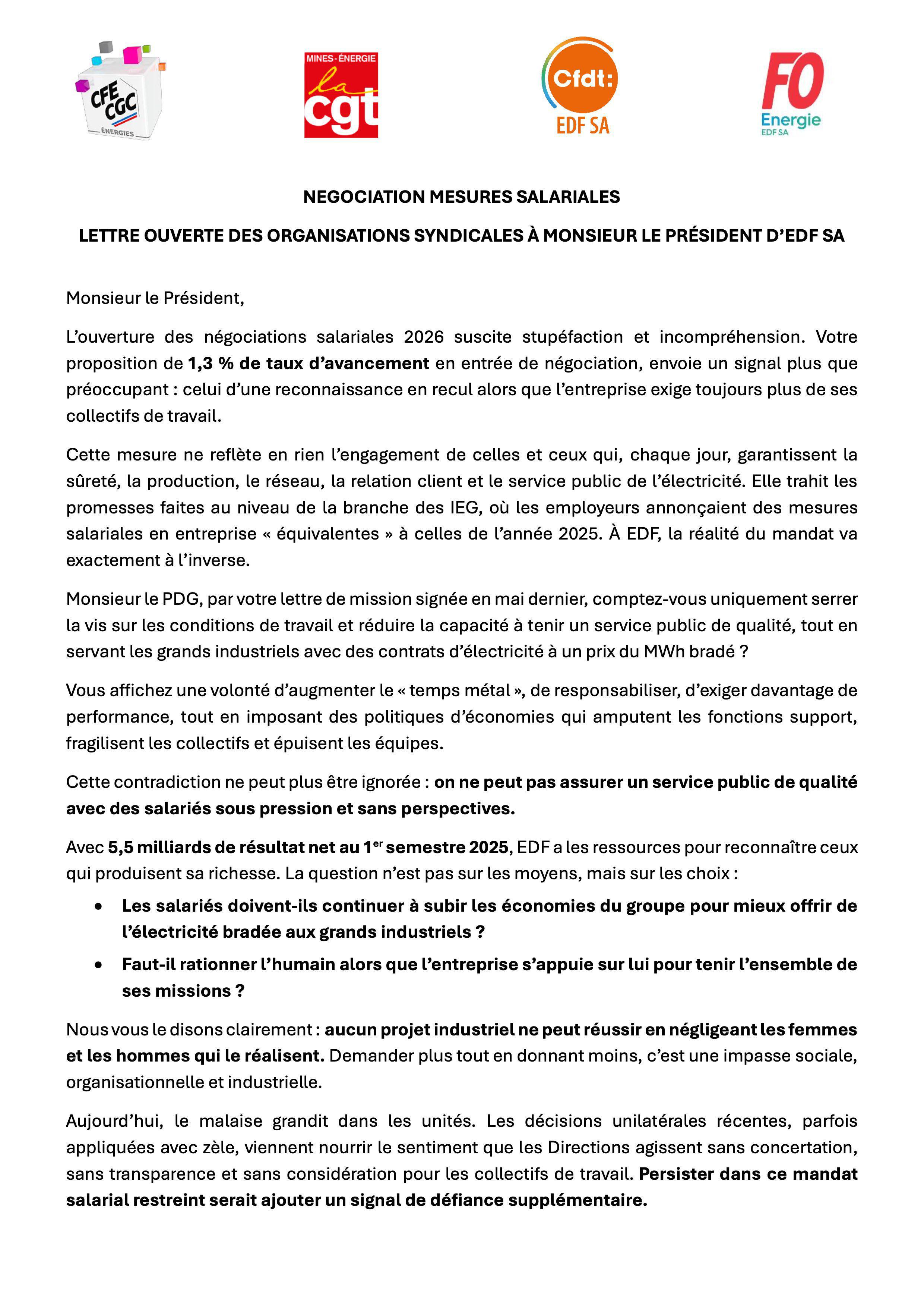 Négociations mesures salariales : lettre ouverte des organisations syndicale à Monsieur le Président d’EDF SA